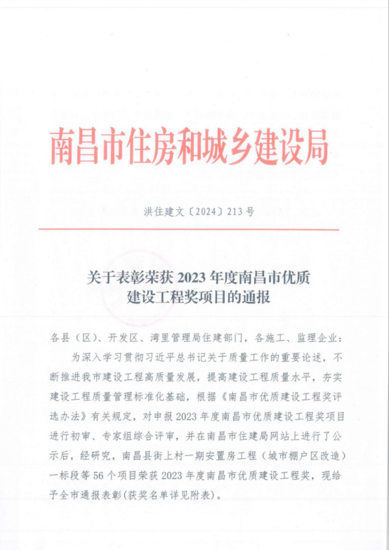 喜报!南昌县城投集团多个项目荣获“2023年度南昌市优质建设工程奖”