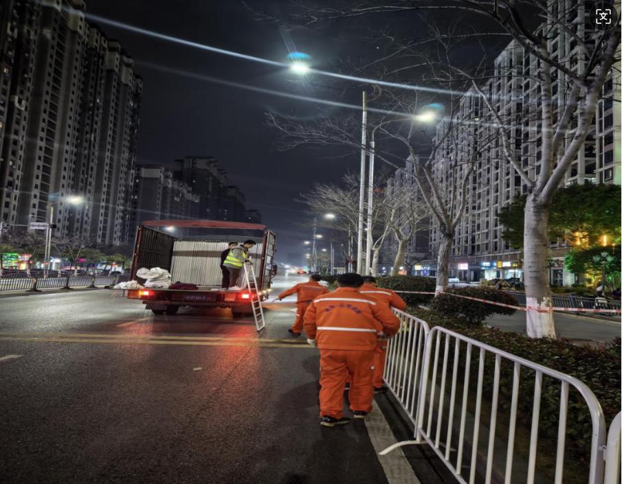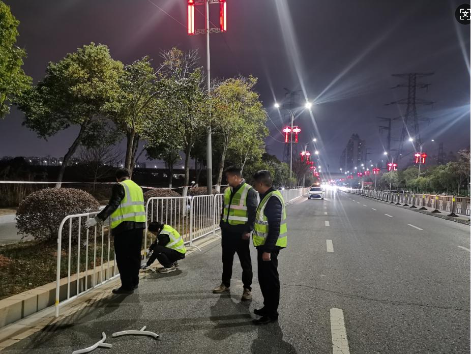 3月8日,公用设施公司全员连夜行动,开展交安设施安装,共完成象湖片区76个赛道路口交安设施封闭工作,在相关点位共投放了约600片拒马、7200片铁马以及反光锥及交通管制牌等设施。通过合理摆放铁马、拒马等交安设施设置出特定的跑道,使人流和车流有序流动,完成了“象湖半马”交通安全保障工作。